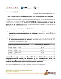 A todas las personas contribuyentes que tienen multas fiscales por incumplimiento de las declaraciones pendientes en años anteriores a 2022, se les informa que el Servicio de Administración Tributaria (SAT) emitió una facilidad que permite hasta el 100 % de reducción de las multas. Para obtener dicha facilidad deberán estar al corriente con sus obligaciones para recibir este beneficio.